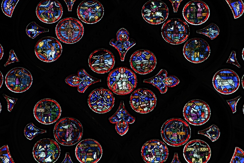 L’idée d’une couleur standard devait donc leur paraître étrange. La composition du verre, la nature et les proportions des oxydes métalliques ajoutés pour obtenir les teintes, ainsi que les conditions des fours et de la confection des feuilles de verre rendaient difficile la production de couleurs normalisées et homogènes. La verrière cosmologique propose également un bel exemple des valeurs symboliques attribuées aux couleurs, avec le vert, le bleu, le rouge et le pourpre qui s’y trouvent ingénieusement reliés aux Quatre Éléments et ainsi subtilement soumis à son ensemble.