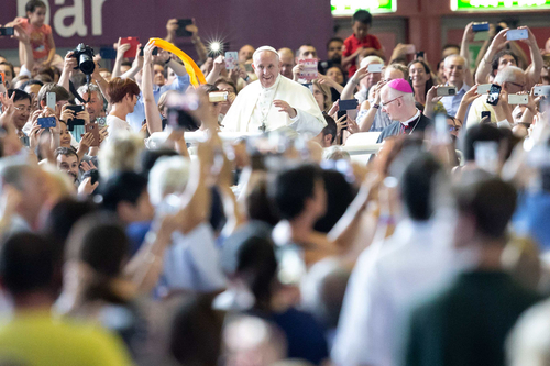Le pape François traverse la foule des fidèles enthousiastes dans sa papamobile. © Jean-Claude Gadmer