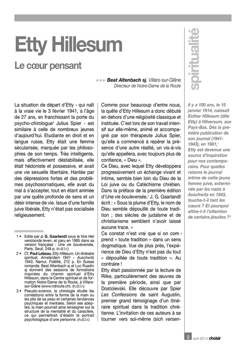 Il y a 100 ans, le 15 janvier 1914, naissait Esther Hillesum (dite Etty) à Hilversum, aux Pays-Bas. Dès la première publication de son journal (19411943), en 1981,1 Etty est devenue une source d’inspiration pour nos contemporains. Pour quelles raisons le journal intime de cette jeune femme juive, exterminée par les nazis à Auschwitz en 1943, touche-t-il tant les cœurs ? Et pourquoi attire-t-il l’attention de certains jésuites ? 2