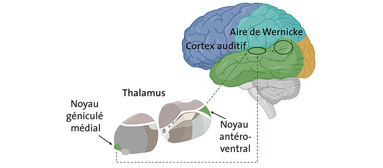 Schéma du cerveau et du thalamus. Les flèches vertes représentent les connexions nerveuses entre les deux noyaux du thalamus et les aires du cortex auditif et de Wernicke. © UNIGE